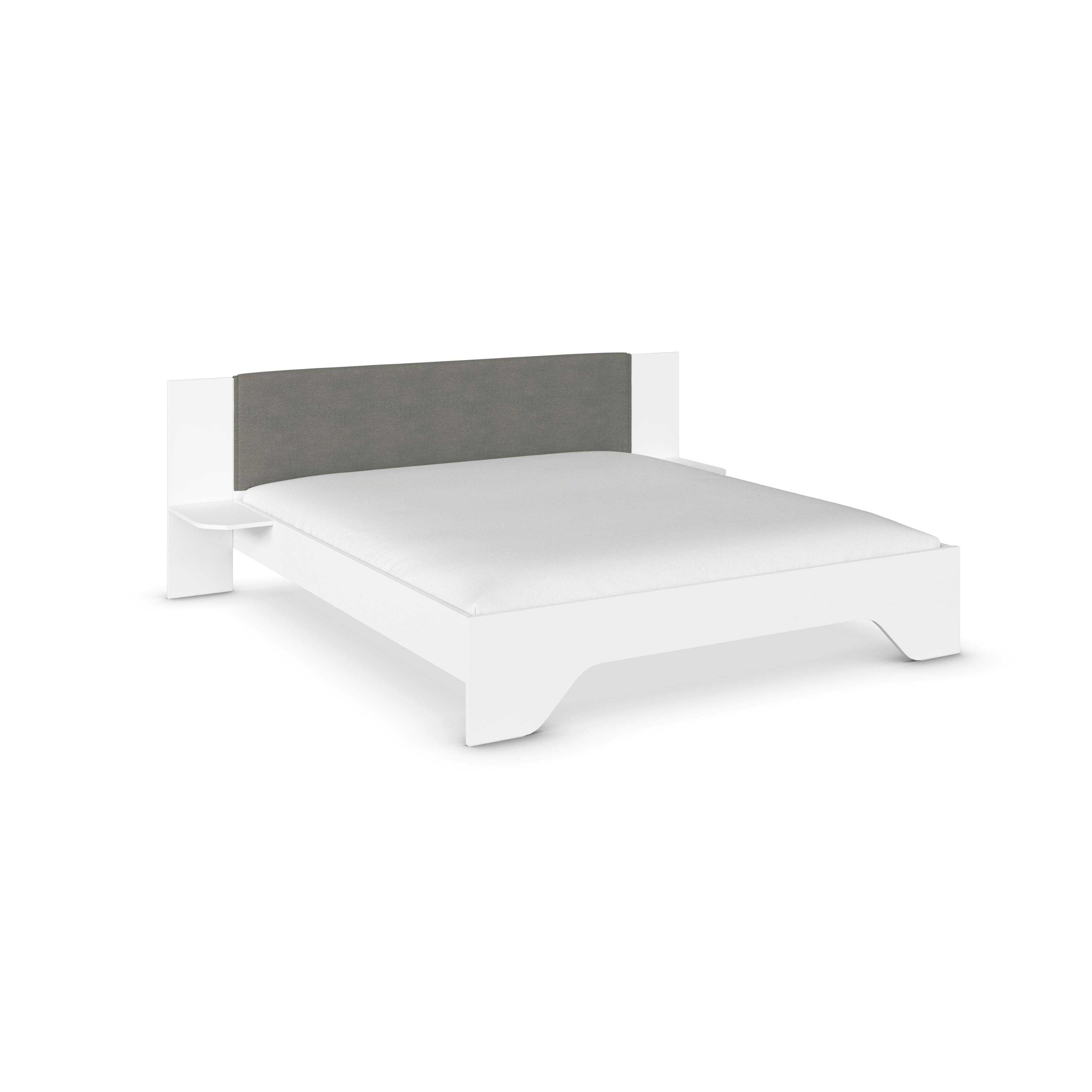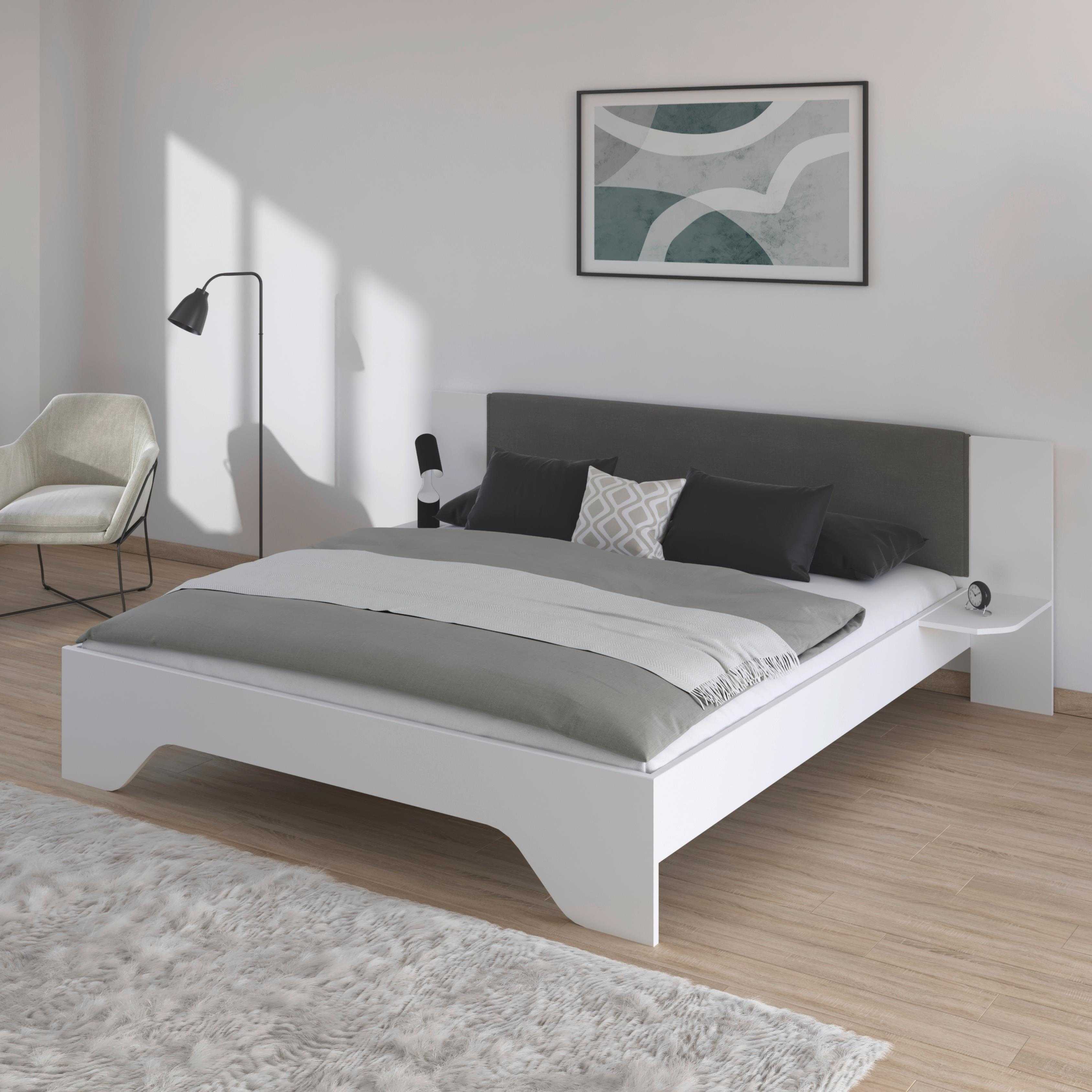 Dieses Bett mit 180 x 200 cm Liegefläche überzeugt durch sein modernes Design und eine praktische, integrierte Nachttischablage. Die großzügige Liegefläche bietet optimalen Komfort für zwei Personen und schafft eine entspannte Wohlfühlatmosphäre im Schlafzimmer. Die integrierte Ablage ersetzt klassische Nachttische und bietet ausreichend Platz für Lampe, Wecker, Bücher oder Dekoration. Dadurch entsteht ein harmonisches Gesamtbild und gleichzeitig eine platzsparende Lösung – ideal für moderne Wohnkonzepte. Dank der klaren Linienführung fügt sich das Bett mühelos in verschiedene Einrichtungsstile ein – von minimalistisch bis zeitlos elegant. Ein funktionales Möbelstück, das Komfort und Design perfekt verbindet