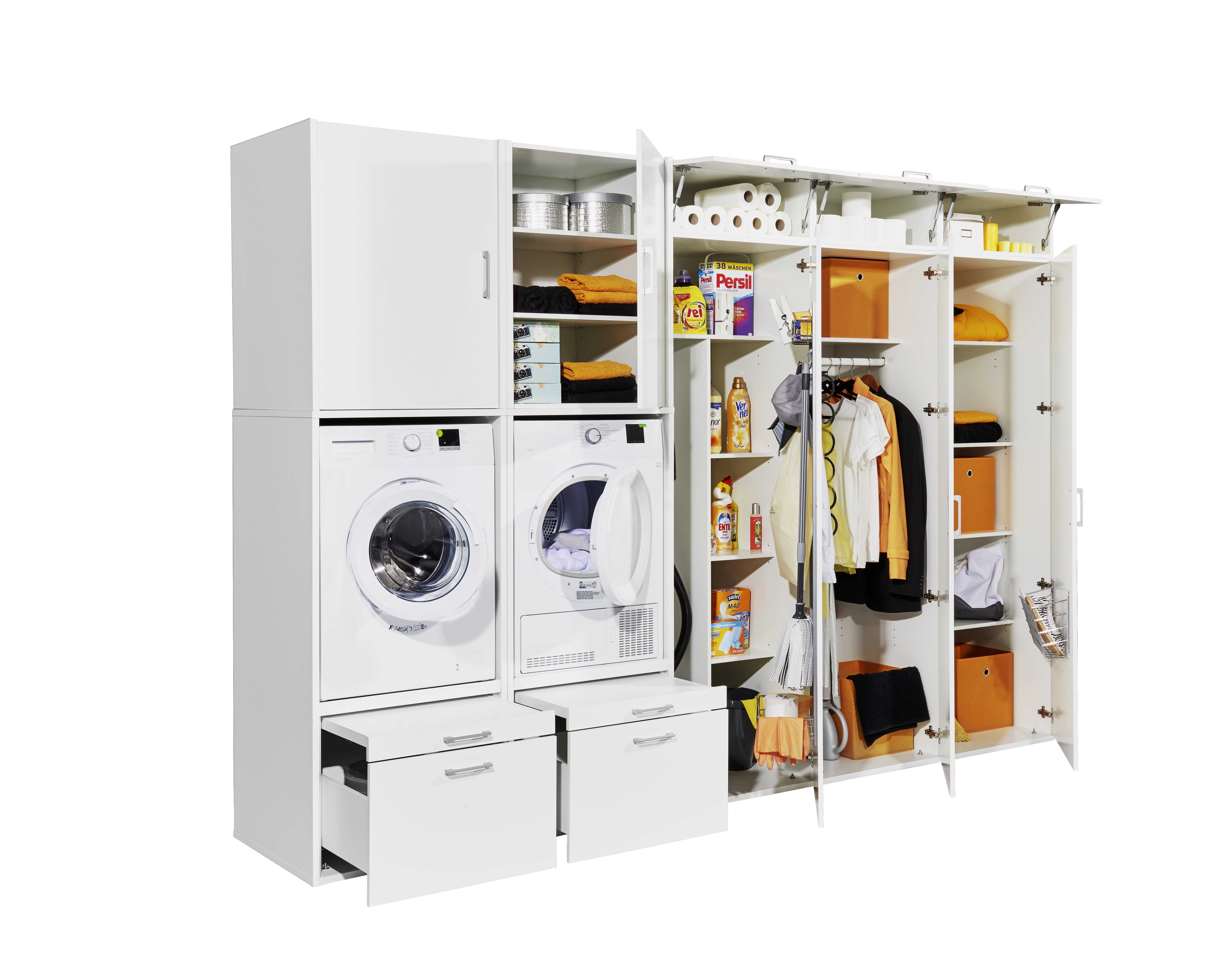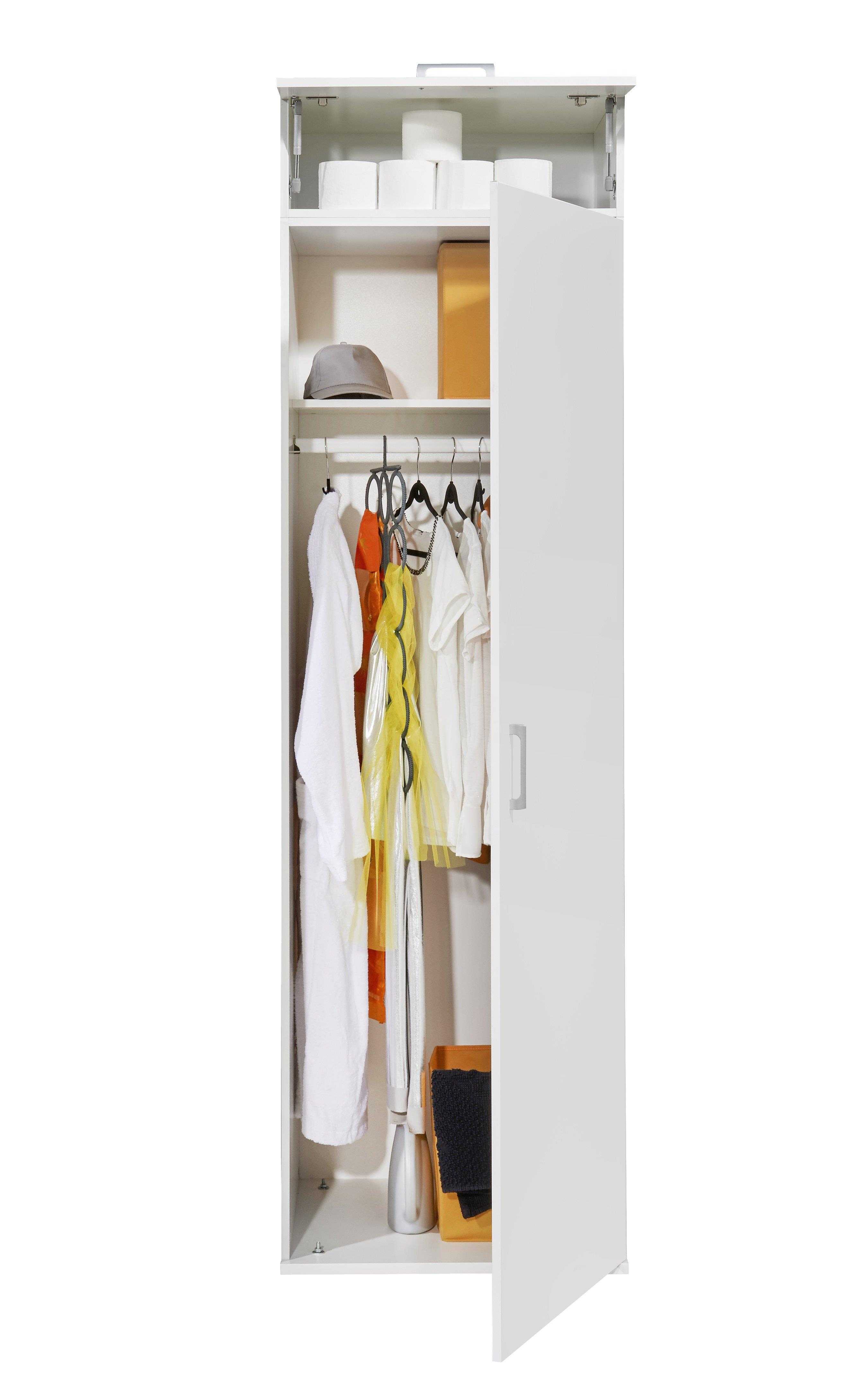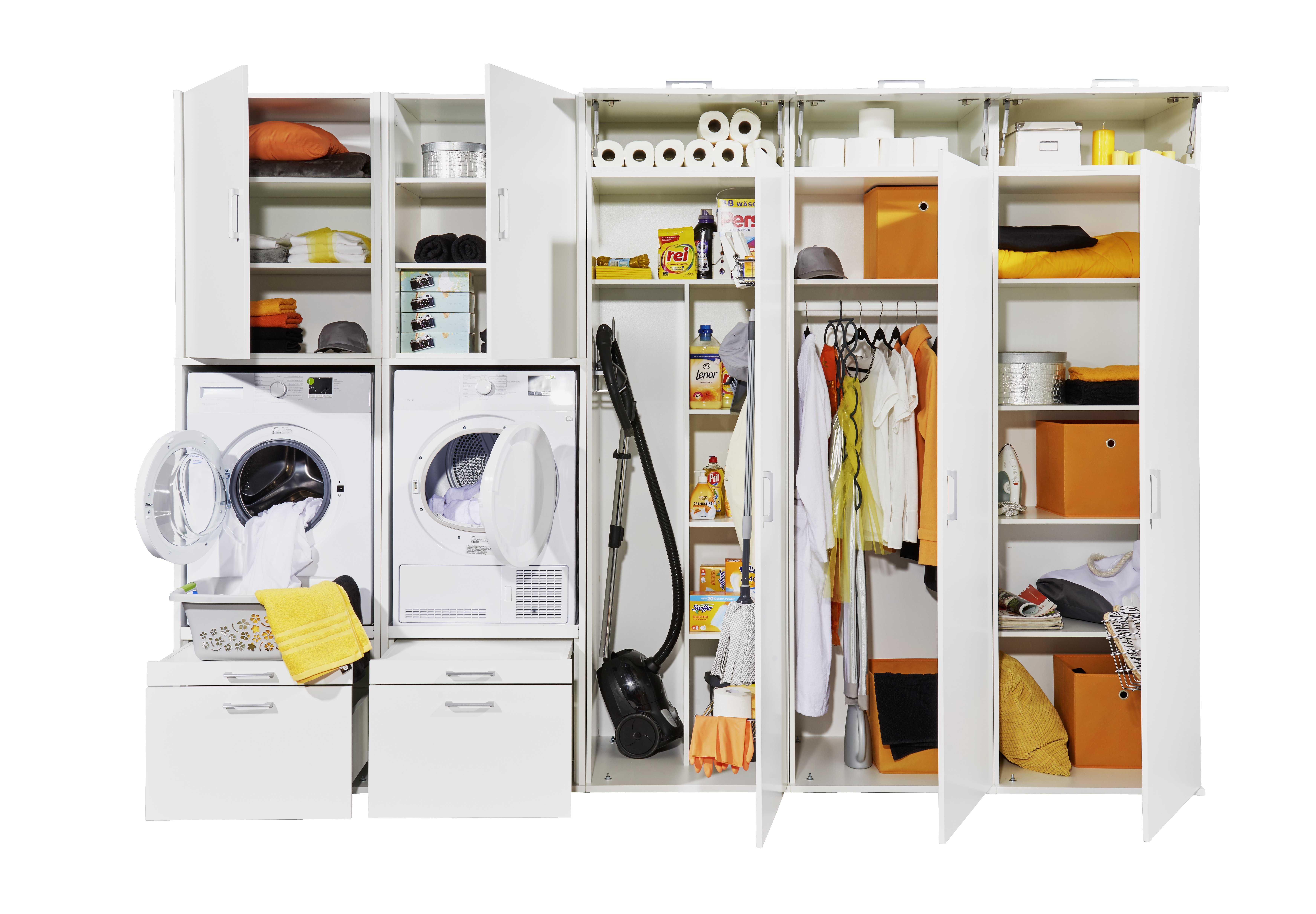 Der Hauswirtschaftsraum Hochschrank bietet viel Stauraum und praktische Aufbewahrungsmöglichkeiten für Haushalt und Wäsche. Ausgestattet mit einem Einlegeboden und einer Kleiderstange eignet er sich ideal zum Aufhängen von Jacken, Arbeitskleidung oder frisch gebügelter Wäsche. Mit seinen Maßen von ca. 60 × 65,4 × 205,5 cm nutzt der Hochschrank die Raumhöhe optimal aus. Die weiße, melaminharzbeschichtete Oberfläche ist besonders abrieb-, stoß- und kratzfest, pflegeleicht und langlebig. Dank des zeitlosen Weiß Dekors fügt sich der Hauswirtschaftsraum Hochschrank harmonisch in jedes Raumkonzept ein und sorgt für Ordnung und Übersicht.