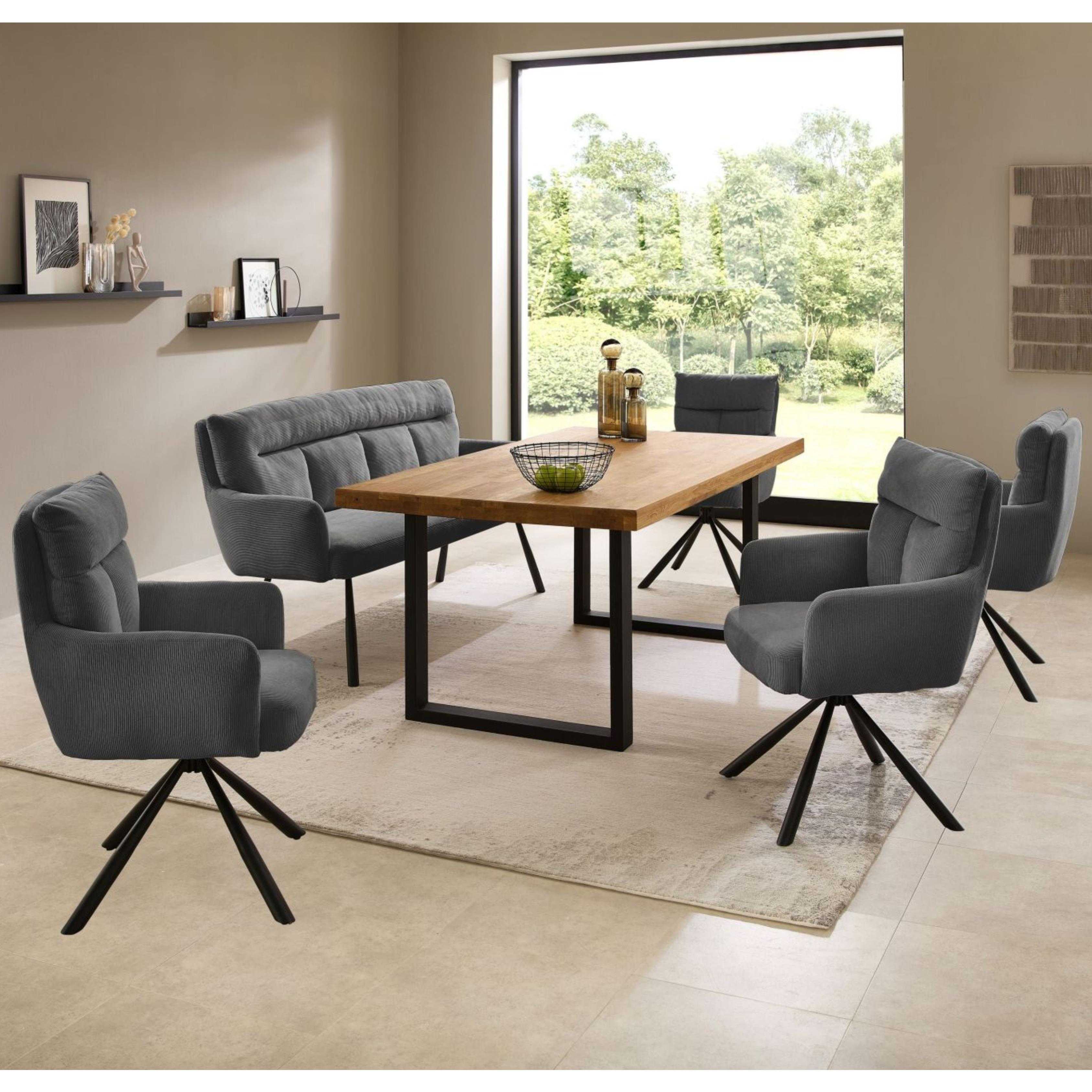 Entdecken Sie die stilvolle Sitzbank mit Armlehnen, die sowohl optisch als auch funktional überzeugt. Der hochwertige Cordstoff in Grau (92% Polyester, 8% Nylon) verleiht der Bank eine moderne und zeitlose Ausstrahlung. Ergänzt wird das Design durch das stabile Metallgestell in Schwarz matt, das für einen edlen Kontrast sorgt.