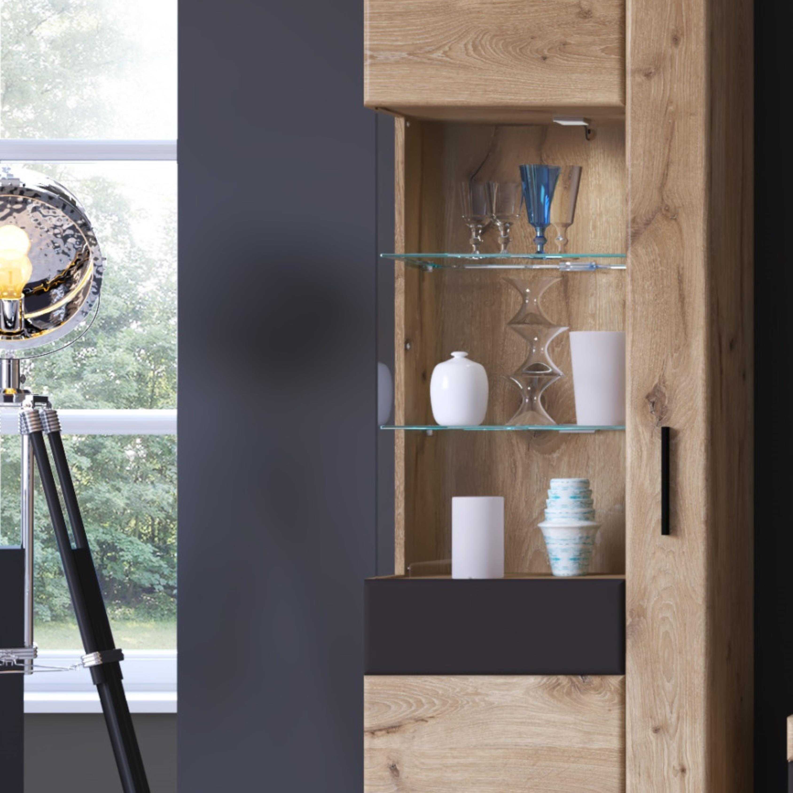 Die Vitrine besticht durch ihr modernes und stilvolles Design in Viking Eiche Nachbildung mit einer Absetzung in Kosmos Grau. Sie bietet eine harmonische Kombination aus natürlicher Holzoptik und zeitgemäßen Akzenten, die sich ideal in verschiedenste Einrichtungsstile einfügt.