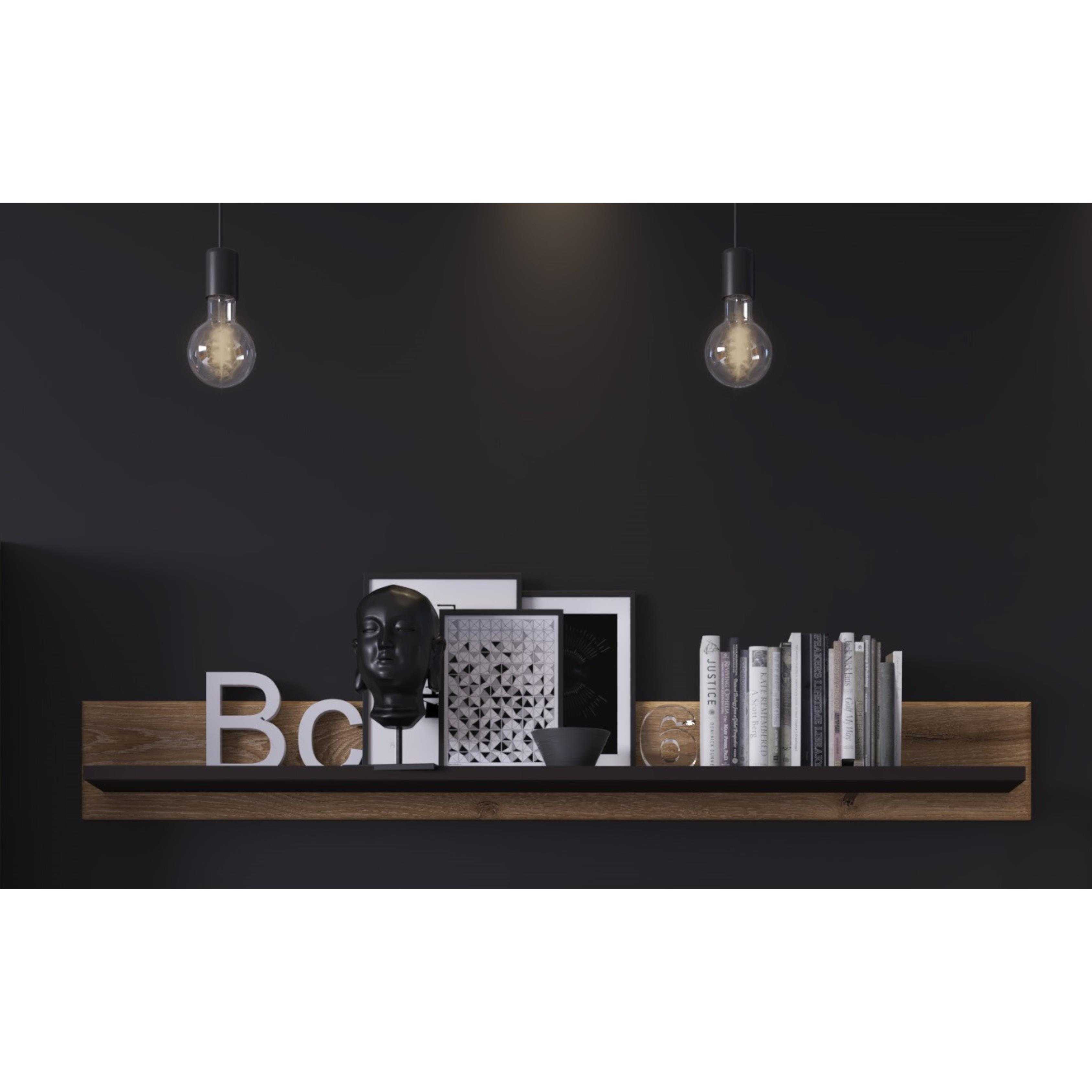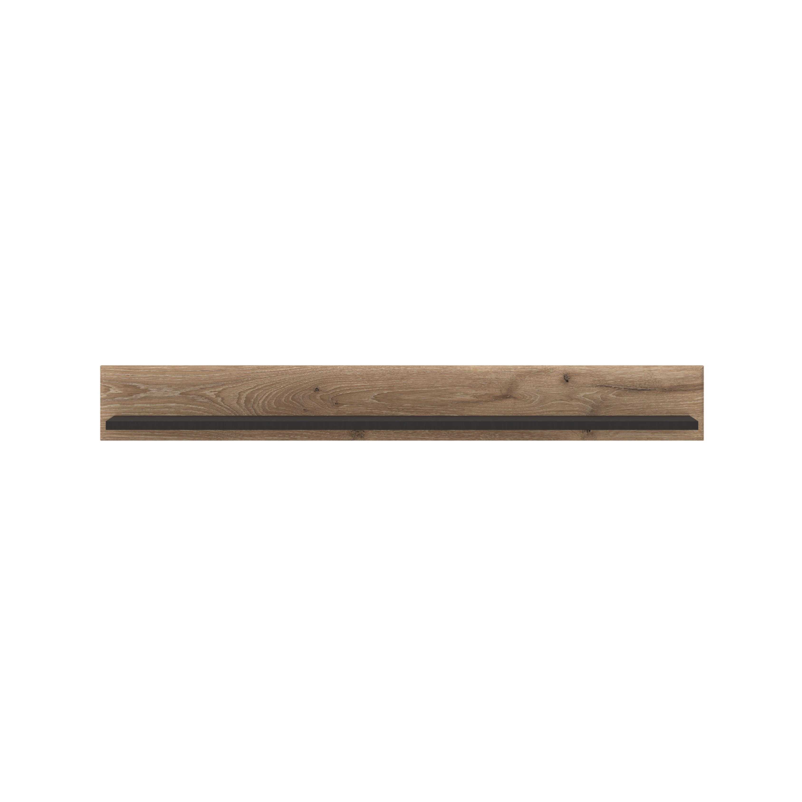 Das Wandregal kombiniert eine moderne Ästhetik mit praktischer Funktionalität. Gefertigt in Viking Eiche Nachbildung mit stilvollen Absetzungen in Kosmos Grau, bietet es eine attraktive Kombination aus natürlicher Holzoptik und eleganten, zeitgemäßen Akzenten.